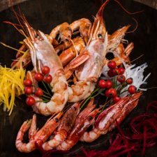 Insalata esotica con gamberi * bianchi e viola cotti a vapore e frutta di stagione.