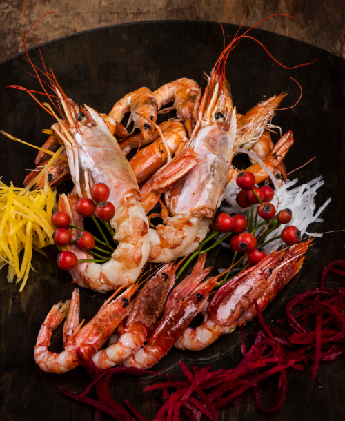 Una selezione di carpacci* e crostacei* ,gamberi rosa e tartare.